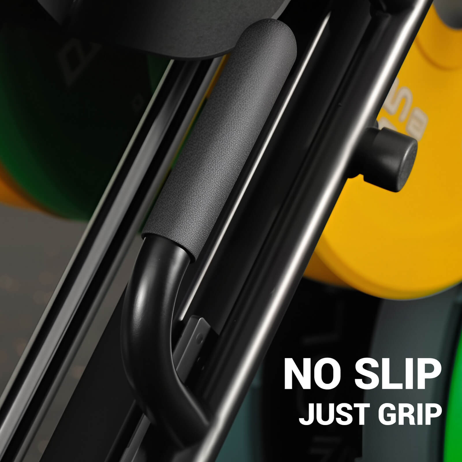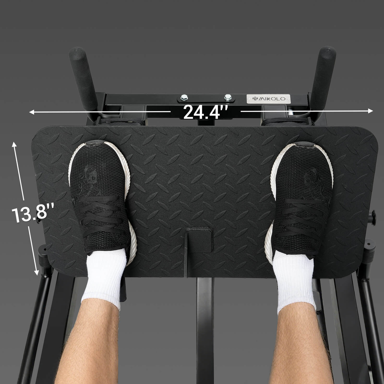 Transform leg day with the DD09 Leg Press & Hack Squat Machine. Compact 19.8 sq ft footprint, 45° ergonomic angle, and oversized 24.4"x13.8" footplate for multiple stances—narrow, wide, high—targeting quads, glutes, and hamstrings effectively. Supports users 4'11"-6'5" with a deep full range of motion for ATG squats and adjustable footplate angles (80°, 90°, 100°) for all ankle flexibilities. Features a quick-adjust ladder footplate, anti-lift backrest stabilizer, and side-mounted 3-position safety limiter for confidence in heavy training. Integrated band pegs reduce sled weight for beginner-friendly sessions while supporting dynamic overload for advanced users. Durable steel foot pedals with anti-slip pattern and sweat-proof handles ensure secure, comfortable reps. With 500 lb capacity and easy-access Olympic plate storage, it keeps your home gym organized while leveling up your lower body strength safely.
