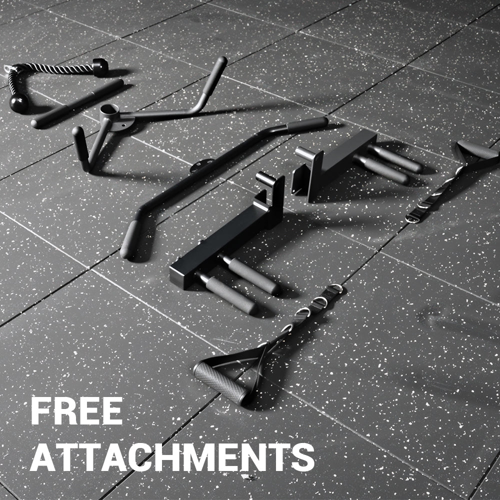 This machine includes a comprehensive set of attachments—dip handles, T-bar, tricep rope, lat pull down bar, cable handle, and more—enabling users to target various muscle groups and expand exercise possibilities. To keep the workout area neat, the HR01 is equipped with a pegboard, dumbbell rack, and dual barbell holders, ensuring essential gear stays organized and within reach.