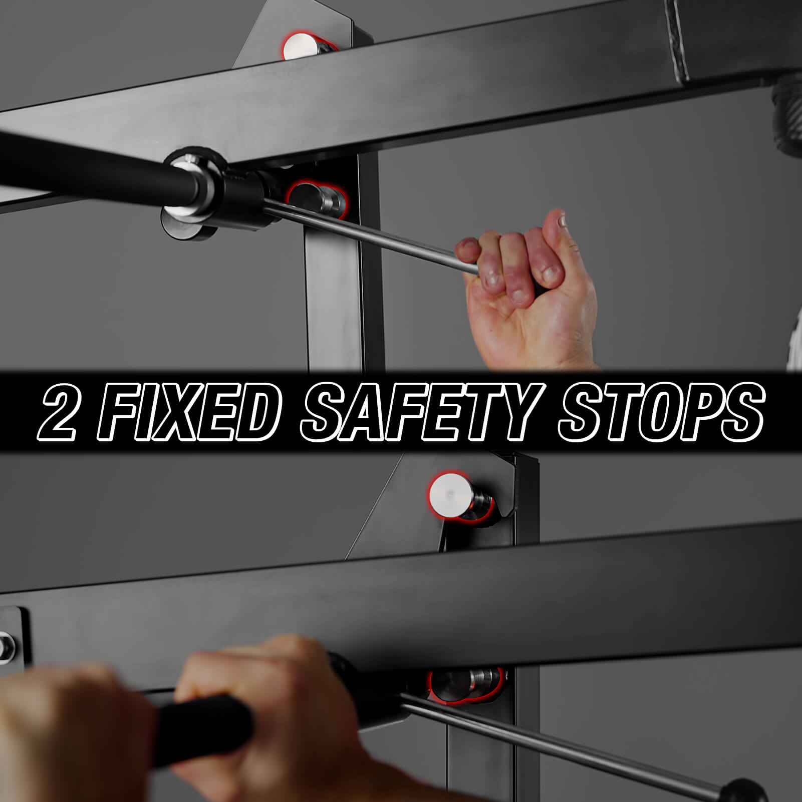 - Safer Stopper and Height Choices - GMWD pendulum squat has a safety stopper at the bottom. So if you can’t complete a rep, you just squat down until the squat machine makes contact against the safety catch. From there, you can weasel out of the machine. It doesn’t need a spotter. Safety stopper positions: 5. Safety height range: 18’’ -23.6’’.