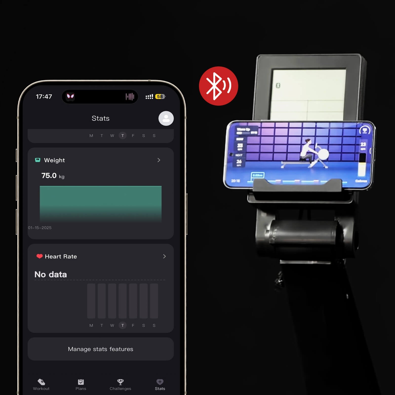 Connect your phone via Bluetooth and dive into guided sessions through the Fit Show app. The built-in device holder keeps everything in view while you track your stats in real time.