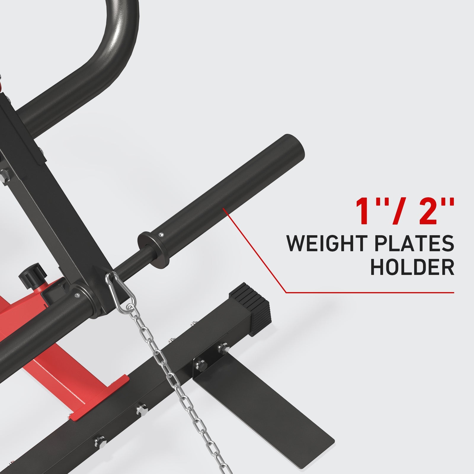 - High Quality Material- The plate loaded tricep machine is composed of heavy-duty steel and premium coatings, making it durable and stable. The comfortable, sweat-resistant seat and backrest provide ample support for intense workouts and long-term use. Measuring only 42.7"x26.2"x51.2", it's the ideal size for any space in your home gym. With a maximum weight capacity of 400 LBS and compatibility with 1" and 2" weight plates, it can meet your most daily training needs. (Plates are not included)
