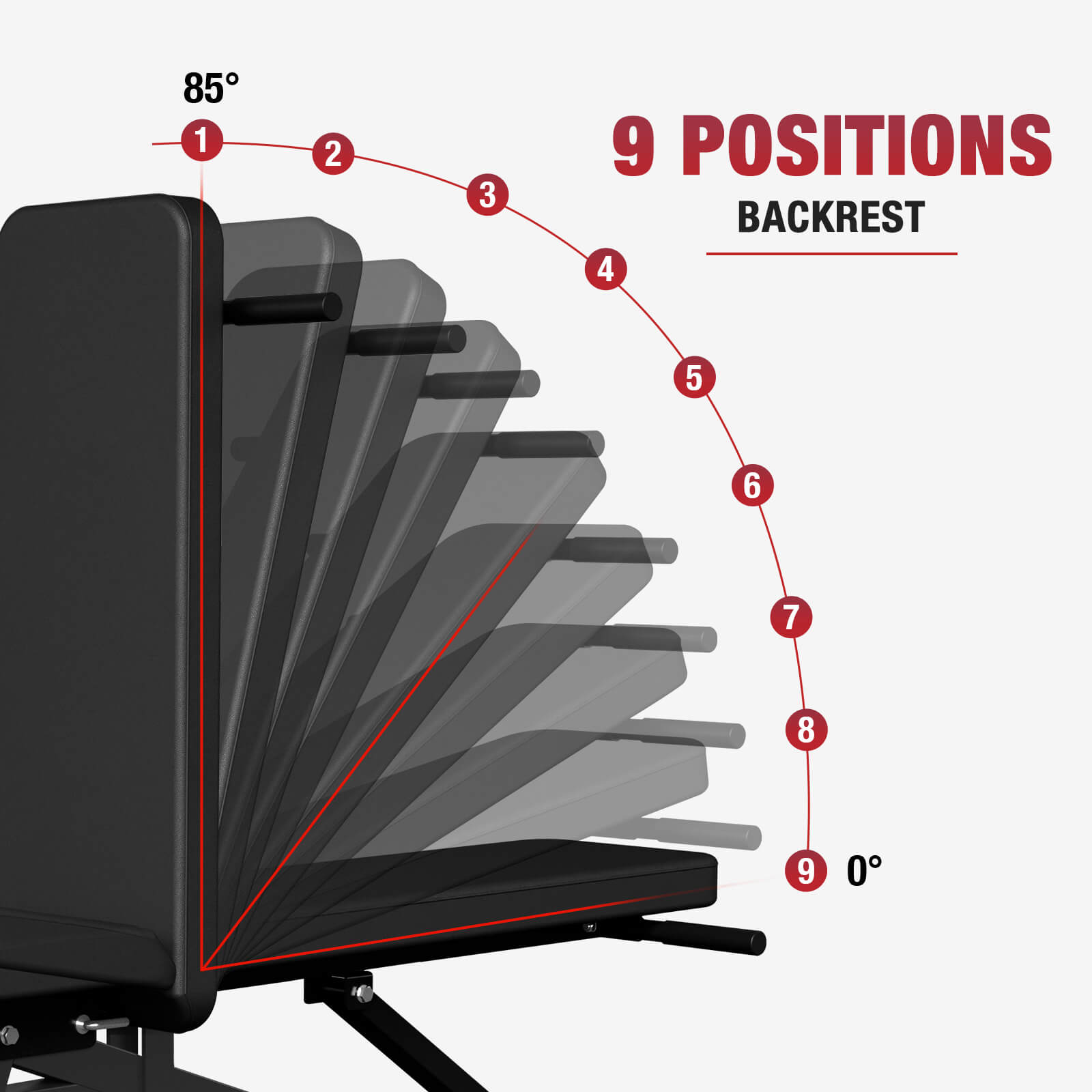 With 9 incline positions (0 to 85 degrees), 2 seat positions, and 3 leg holder positions, the GMWD 9-2-3 Adjustable Weight Bench provides customizable configurations to suit any exercise regimen. The improved adjustment arm allows for quick and seamless transitions between different workouts and athletes, making it an ideal choice for shared fitness spaces.