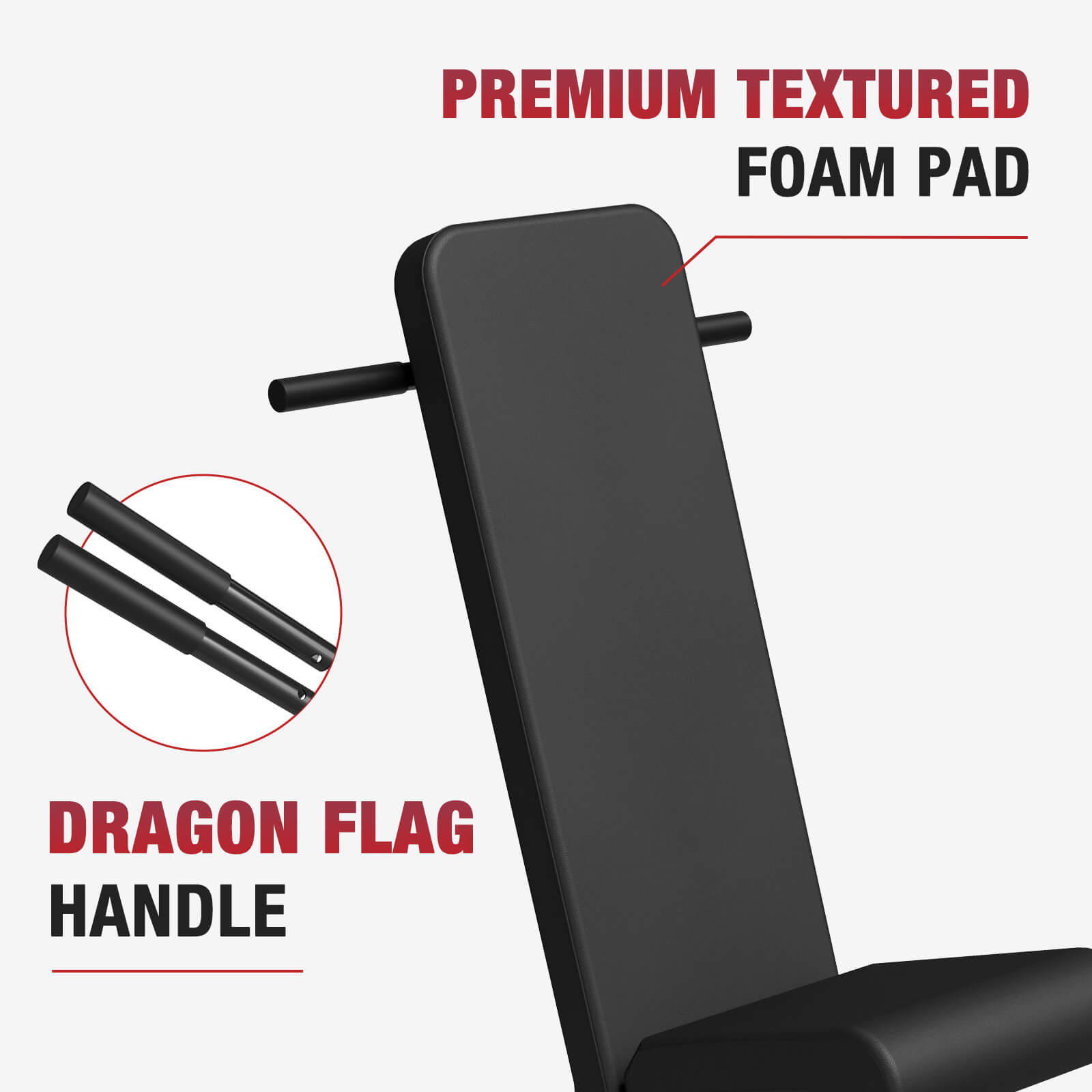 The GMWD weight bench includes a special dragon flag handle, allowing for exercises like dragon flag and dragon thruster to effectively target the abdomen and glutes. This feature adds versatility and value, making it a cost-effective choice for those looking to enhance their abdominal and lower body strength.